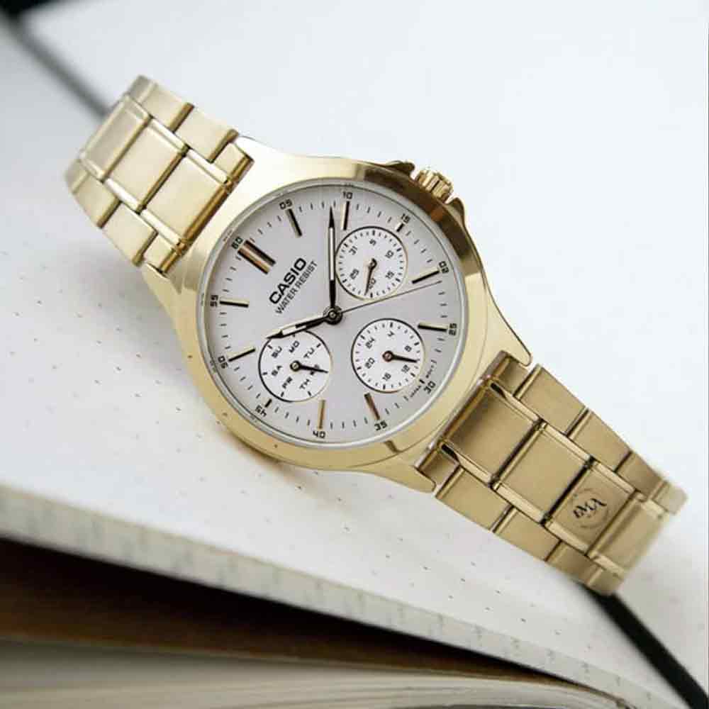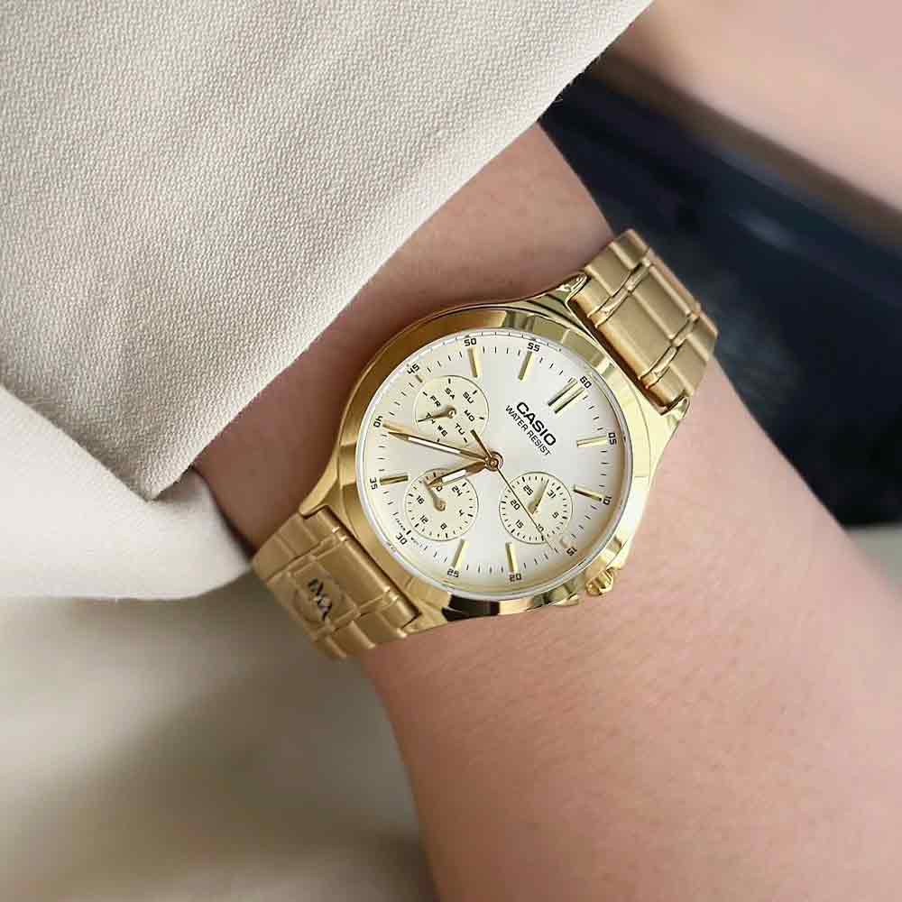 ساعت مچی زنانه کاسیو مدل LTP-V300G-9A، انتخابی برجسته برای بانوان حرفهای که به دنبال ترکیبی از زیبایی و کارایی پیشرفته هستند. این مدل با صفحه چندمنظوره (Multi-Dial)، اطلاعات بیشتری از زمان را در اختیار شما قرار میدهد و ظاهری بسیار شیک و مجهز به استایل شما میبخشد.