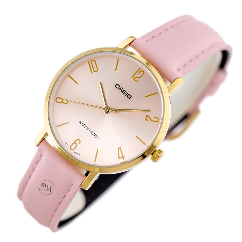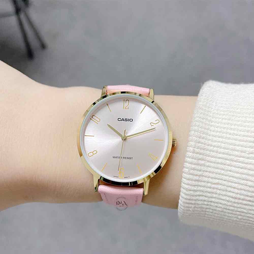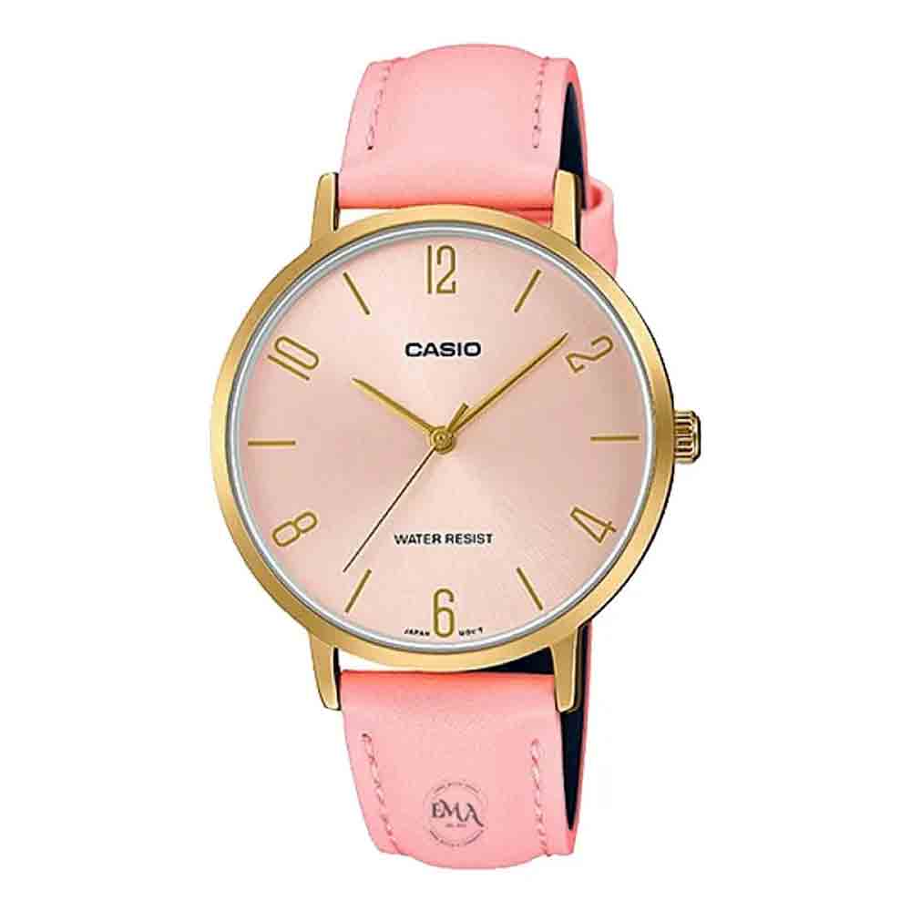 این ساعت از کلکسیون جنرال ltp کاسیو با طراحی مدرن و مینیمال با قاب پوشش طلایی (Gold-Tone) و بند چرم با دوام صورتی طیف وسیعی از لباس‌ها، از استایل کژوال تا رسمی، هماهنگ می‌کند.